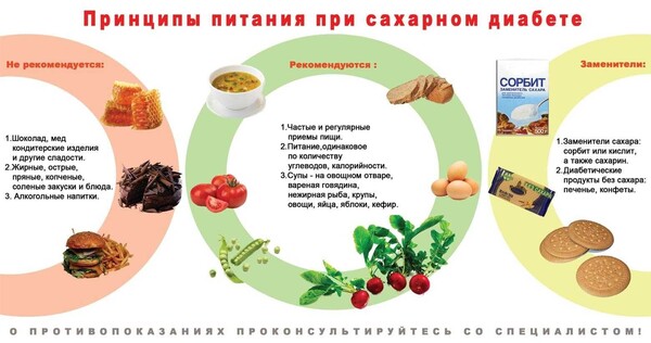 - не допускать избыточного веса; - заниматься физкультурой; - отказаться от курения и избыточного употребления алкоголя; - регулярно следить за уровнем глюкозы в крови, артериальным давлением, общим холестерином; - не реже 1 раза в месяц проходить осмотр эндокринолога, не реже 1 раза в год – полный медицинский осмотр; - не подвергать себя стрессам; - принимать лекарственные препараты строго по назначению врача; - соблюдать лечебную диету. Особенности питания. Диета при сахарном диабете соблюдается на протяжении всей жизни, так как пациентам требуется постоянный контроль за массой тела и уровнем глюкозы. Одной из сложностей при её составлении становится выбор продуктов, которые должны обеспечивать пищевое разнообразие. Важно позаботиться и о вкусе блюд, учесть предпочтения диабетика. Стоит учесть, что употребление искусственных заменителей сахара на основе сахарина или аспартама может ухудшить здоровье, поэтому лучше выбрать вещества на натуральной основе.