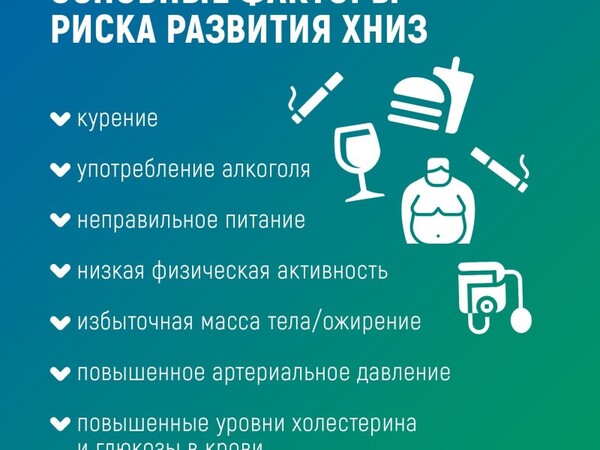 50% вклада в развитие ХНИЗ вносят основные 7 факторов риска: курение, нерациональное питание, низкая физическая активность, избыточное потребление алкоголя, повышенный уровень артериального давления, повышенный уровень холестерина в крови, ожирение.