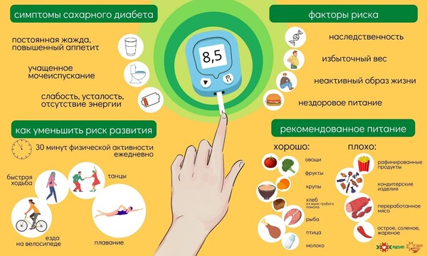 Главное о диабете. Риск развития диабета первого типа может быть врожденным, но правильное питание и укрепление иммунитета снижают вероятность развития заболевания. Диабет второго типа — следствие малоподвижного образа жизни и переедания. Определить, не повышен ли уровень сахара в крови, можно, сдав анализы в районной поликлинике.