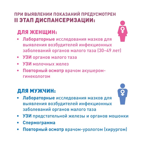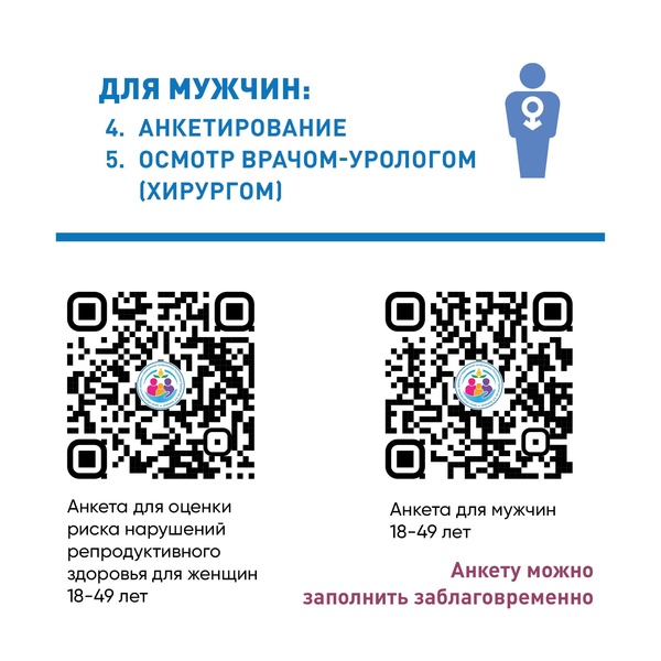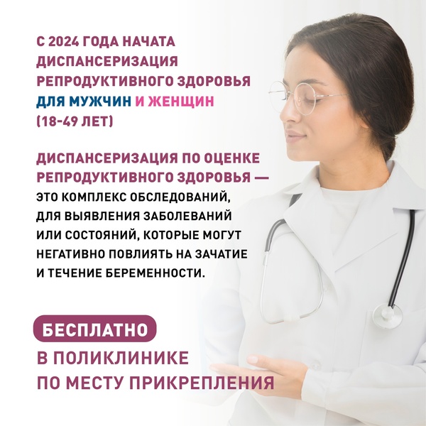 С 2024 года проводится диспансеризация репродуктивного здоровья мужчин и женщин в возрасте от 18-49 лет. Цель - выявление состояний и заболеваний, негативно влияющих на зачатие и беременность, а также на роды и послеродовой период.