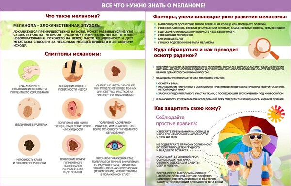- Регулярно проводите самоосмотр кожи. Используйте зеркало в полный рост и ручное зеркало, для того, чтобы осмотреть себя со всех сторон. Раз в месяц осматривайте свою кожу. Посмотрите на родинки и веснушки, обратите внимание, не изменилась ли их форма, размер, цвет родинки и кожи вокруг нее. - По возможности исключите длительное воздействие на кожу прямых солнечных лучей и ультрафиолетовых лучей в солярии. - Защищайте открытые участки кожи от интенсивного солнечного облучения с помощью одежды и солнцезащитных кремов. - Регулярно применяйте питательный крем для предупреждения сухости кожи. - Защищайте рубцы и родинки от механических травм. - Соблюдайте технику безопасности и правила личной гигиены при работе со смазочными материалами и веществами, содержащие канцерогены. Помните! При раннем выявлении – рак кожи излечим! Будьте здоровы!