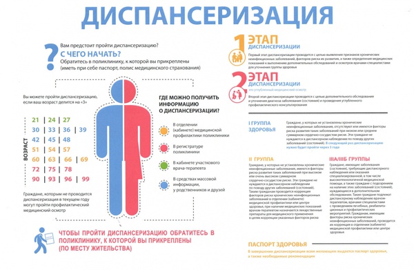 Диспансеризация – комплекс диагностических исследований, который проводится с целью профилактики и оценки здоровья россиян. По результатам комплексного исследования каждому пациенту присваивается группа здоровья и при необходимости осуществляется его постановка на диспансерный учет. Законодательная база. Проведение диспансеризации регламентируется следующими нормативными актами: - Правительственным распоряжением №1391-р от 27.06.19. - Приказом Министерства здравоохранения №124-н от 13.03.19. Приказ Минздрава вступил в действие 6 мая 2019 года. Он определяет порядок проведения диспансеризации, годы рождения пациентов, которые попадают под прохождение в 2020-2021, другие важные нюансы. Периодичность. Ранее все граждане Российской Федерации начиная с 18 лет могли проходить обследование раз в 3 года. После министерского приказа периодичность его проведения для разных возрастных групп изменилась. Теперь: - Лица в возрасте 18-39 лет – раз в 3 года. - 40 лет и старше – ежегодно. Ежегодно. Для возрастной категории 40+ в 2021 и последующие годы диспансеризация является ежегодной. Соответственно, лица, родившиеся в период до 1981 года, могут пройти плановое медицинское обследование в 2021 году – и далее продолжать так делать каждый год. Есть отдельная категория граждан, которые также проходят обследование каждый год. Это: - инвалиды боевых действий; участники и инвалиды ВОВ; - жители блокадного Ленинграда, получившие инвалидность по общему заболеванию и другим причинам; - бывшие заключенные концентрационных лагерей, фашистских гетто и других подобных мест, получившие инвалидность; - работающие граждане, которым до пенсии по старости осталось 5 лет; - работающие пенсионеры, в том числе вышедшие на заслуженный отдых по выслуге лет.... Раз в 3 года. Для тех, кому еще нет 40 лет определены такие годы рождения, которые попадают под обязательное прохождение: - 2003, - 2000, - 1997, - 1994, - 1991, - 1988, - 1985, - 1982. Самый простой способ определить, нужно ли проходить обследование в конкретном году, — разделить возраст на 3. Если в результате деления получается число без остатка, то нужно. Кстати, при подсчетах учитывается именно год, а не дата рождения. Наблюдение детей и подростков. Для детей и подростков Министерство здравоохранения установило собственный график посещения медицинских учреждений и планово-профилактических осмотров. Возраст и периодичность диспансеризации детей и подростков в 2021 году - 0-12 месяцев ежемесячно у педиатра; - 1-2 года раз в 3 месяца; - 2-3 года раз в 6 месяцев; - с 4 лет ежегодно. Расширенный медицинский осмотр (педиатр и специалисты узкого профиля, необходимые лабораторные анализы) следует проходить в возрасте: - 3 лет – при поступлении в детское дошкольное учреждение; - 6-7 лет – перед поступлением в общеобразовательное учреждение; - 14-17 лет – так называемый пубертатный период... Диспансеризация в Москве и других регионах России включена в перечень услуг обязательного медицинского страхования и проводится бесплатно. Пройти ее можно в любом медицинском учреждении, которое имеет лицензию. Обычно граждане обращаются в поликлинику по месту жительства, за которой закреплены.... Организацией профилактического обследования занимается участковый терапевт, обслуживающий конкретную территорию. В его обязанности входит: - информирование граждан о графике работы поликл